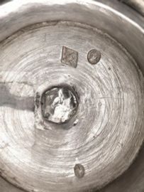 corpo piriforme su tre piedini a zoccolo equino stilizzato, manico dritto in legno tronito, finale del coperchio a trottola, alt. cm 29, g 1210