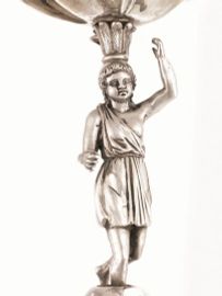 base circolare profilata a palmette, fusto realizzato come un giovinetto in abiti classici, coppa porta olio a tre beccucci decorati da volti bacchici, coperchio con finale modellato a fanciullo con cane, ventola elegantemente realizzata come due farfalle, completa di tre attrezzi alt. cm 41, base appesantita