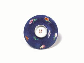 CINQUE COPPETTE CINA SEC. XIX in porcellana policroma, famiglia rosa, a fondo azzuro "sgraffiato", decorate con fiori, diam 10 FIVE PORCELAIN TEA BOWLS CHINA 19TH CENTURY