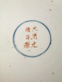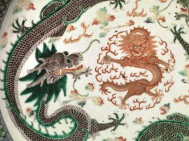 Grande piatto Cina sec. XVIII - XIX, tarda dinastia Qing, della famigliaverde in porcellana wucai , decorato con un drago centrale color ruggine e due grandi draghi nei toni del verde che si affrontano, diam. cm 40