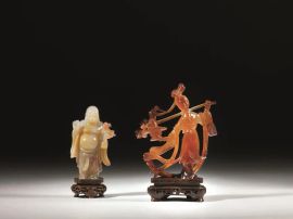 Intaglio, Cina sec. XIX, in corniola, raffigurante figura femminile che porta un bastone sulla spalla alla cui estremità è appeso un vaso con composizione fiorita, alt. cm 16 su base in legno alt. cm 3