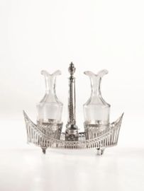 Oliera, Parigi, 1789, in argento, base realizzata a barca traforata, quattro piedini scanalati, porta ampolle traforati, fusto centrale di forma troncoconica con presa a forma di vaso, completa di reggi tappi uniti al corpo da catenelle e di due ampolle non pertinenti, alt. cm 24, g 580
