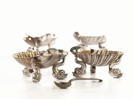 Sei coppette lavadita, sec. XX, in argento modellato a conchiglia, g 830 ed un set di quattro saliere con cucchiaino, Birmingham, 1863, in argento modellato a conchiglia, interno vermeil, g 176, entro astuccio (10)