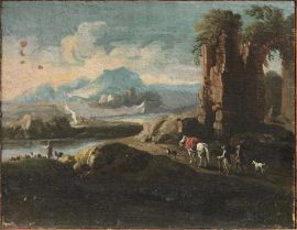 PAESAGGIO CON PONTE SUL FIUME, CONTADINI E ARMENTI
