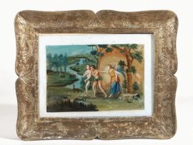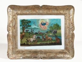 quattro dipinti su vetro raffiguranti Scene dalla Genesi, cm 40,5x29, entro cornici in legno intagliato e dorato,