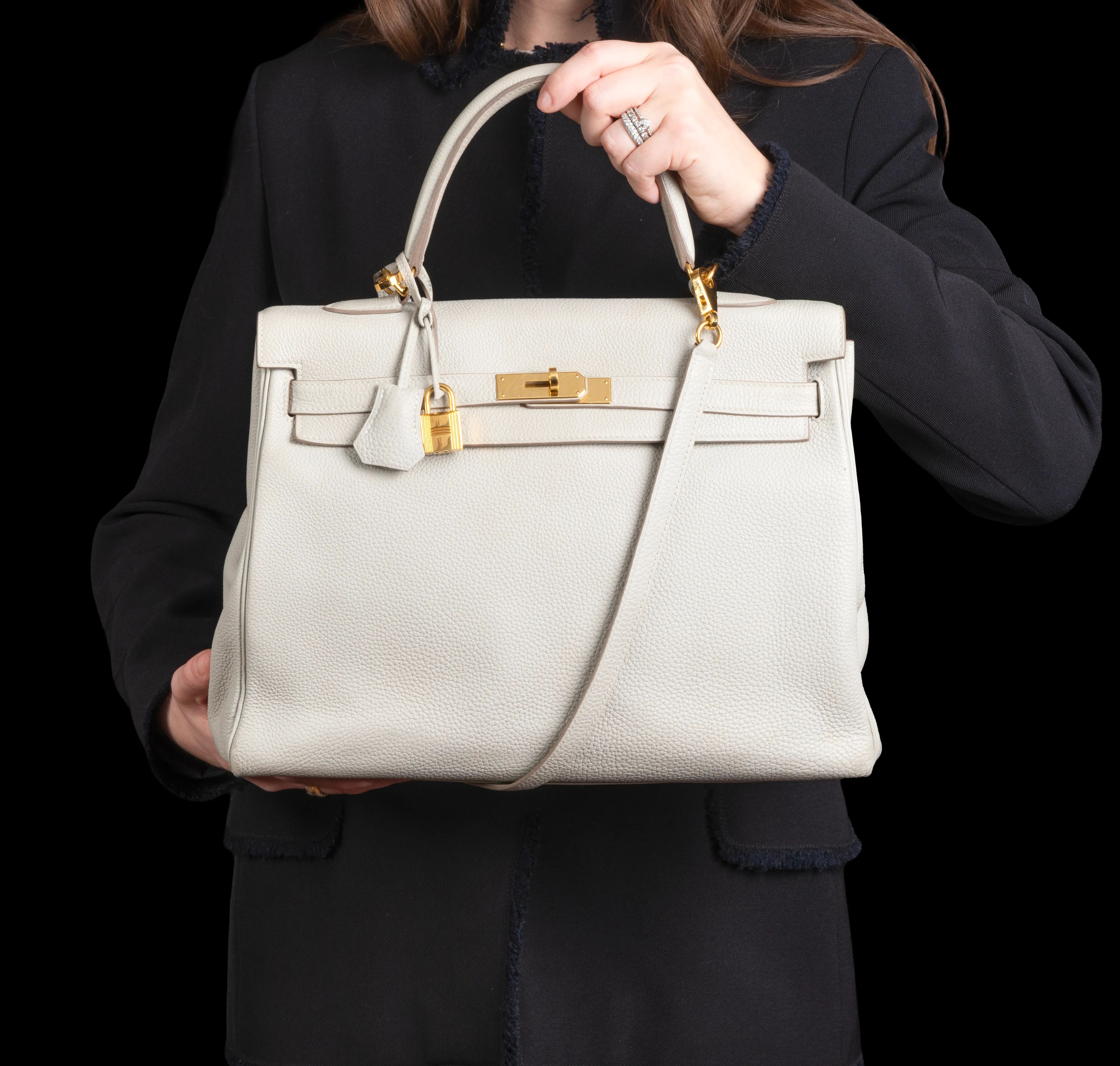 La Kelly Retourne 35 rappresenta il perfetto equilibrio tra la capienza di una borsa da giorno e la raffinatezza tecnica della pelletteria Hermès. Il colore bianco ghiaccio del morbido pellame ne fa un'icona di stile quotidiano.
