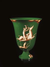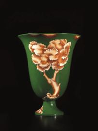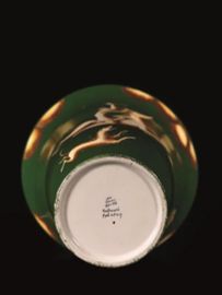 Vaso in maiolica policroma a fondo verde con figurazione giallo-bruno
