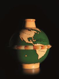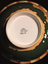 Vaso in maiolica policroma a fondo verde con decoro giallo-arancio, e circonferenza in rilievo al centro
