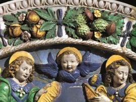 Quest’animata, rutilante lunetta invetriata, che vanta una cospicua letteratura critica concorde nell’assegnarla a Giovanni della Robbia e una ragguardevole vicenda collezionistica essendo appartenuta al Kunstgewerbe Museum di Colonia, si pone fra le più rappresentative testimonianze del maestro confluite sul mercato antiquario negli ultimi decenni. Giovanni - che fu il più autonomo e prolifico tra i numerosi figli ed eredi nell’arte di Andrea della Robbia, dal quale si distingue per una spiccata esuberanza cromatica e ornamentale, ma anche per una maggiore vivacità formale di matrice verrocchiesca - rivela infatti in quest’opera le sue doti migliori, immune dalle frequenti contaminazioni di un’operosa bottega. Le cogliamo nella notevole qualità del modellato, forbito nella definizione arguta dei volti ricciuti, vibrante nello sviluppo dei panneggi sbattuti dal vento, nella fantasiosa e raffinata vena decorativa delle vesti, impreziosite da monili e ricami, nel rigoglioso festone vegetale che percorre la cornice sorgendo da due eleganti vasi all’antica, come pure nelle tonalità vivide e nel virtuosismo tecnico dell’invetriatura, che ottiene effetti naturalistici negli incarnati e cangianti screziature nelle ali, tinteggiando nel cielo cirri vaporosi.