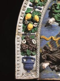 Espressione di una ben calibrata varietà inventiva e di un notevole magistero tecnico è anche il lussureggiante festone di frutti, verzure e fiori che ravviva l’ampia cornice di tipo marmoreo, profilata da modanature a ovoli e intreccio (sezionata in sette pezzi). Il serto, costituito da dodici mazzi di specie vegetali diverse (grappoli d’uva, limoni, cetrioli, agrumi, melograni, spighe, castagne, carciofi, mele, zucche, pigne, etc.), cadenzati dai fiocchi di un nastro azzurro, è sostenuto da due ricercati vasi ad anfora, con corpo sbaccellato e finemente ornato da motivi all’antica, invetriati d’azzurro a imitazione del lapislazzuli, che posano su basi di gusto archeologico.