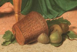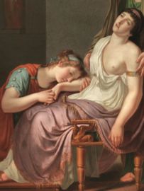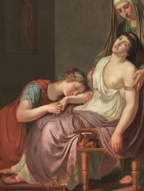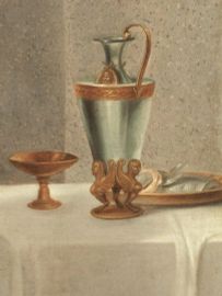 In significativo anticipo su manufatti realizzati a Napoli alla corte di Gioacchino Murat, presso la quale Schmidt fu attivo dopo il 1811, il dipinto qui offerto mostra ad esempio il trono di Cleopatra ornato da sfingi che ne sorreggono i braccioli, in tutto simile a una serie di sedie realizzate nei primi anni dell’Ottocento, ora nel Palazzo Reale di Napoli (cfr. E. Colle, Il mobile Impero in Italia. Arredi e decorazioni d’interni in Italia dal 1800 al 1843, Milano 1998, p. 52, ill., p. 394, 9 a). Altre sfingi in bronzo dorato ornano la base del versatoio sul tavolo, e una divinità egizia (Iside?) si intravvede in una nicchia sullo sfondo.