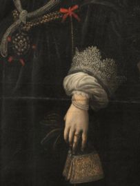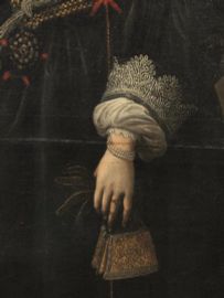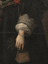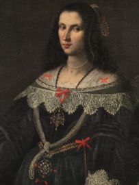 I dettagli dell’abbigliamento dell’effigiata, come i polsini a lattughe inamidate e l’ampio colletto di pizzo a palmette con doppie volute, permettono di datare più precisamente la nostra opera intorno agli anni trenta del Seicento, considerando anche le affinità stilistiche con il ritratto di Francesco I d’Este del Musées d’Art et d’Histoire di Ginevra dipinto intorno al 1633 da Matteo Loves (La pittura in Emilia Romagna. Il Seicento, tomo secondo, a cura di J. Bentini, L. Fornari Schianchi, Milano, 1993, fig. a p. 225).