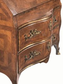 lastronato in varie essenze a creare decori geometrici, alzata con cimasa a timpano spezzato e applicazioni in bronzo a formare tralci terminanti in una conchiglia rocaille, due sportelli sagomati con specchio inciso a motivo di vasi con fiori, corpo inferiore con sportello a ribalta celante interno con sei cassetti, fronte mosso a due cassetti, pendaglina sagomata, gambe sinuose calzate da piedini in bronzo, cm 267x115x66