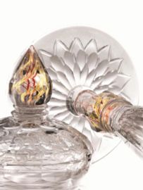 in vetro incolore di grosso spessore, corpo conico con sottili costolature verticali ottenute a mola inciso con stemma gentilizio e trofeo d'armi, ampia base circolare molata a rosone e piede a balaustro impreziosito dal l'inclusione di filamenti vitrei rosso e oro, decorazione che ritorna anche nella presa del coperchio, anch'esso inciso a motivi vegetali, alt. cm 34