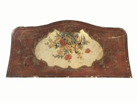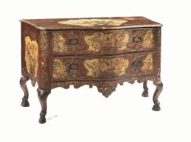 in legno laccato; piano sagomato, fronte mosso a due cassetti, fianchi dritti e pendaglina sagomata, gambe mosse su piedi a zoccolo equino. L'intera superficie, laccata a fondo rosso aragosta, è impreziosita da riserve sagomate con decoro a motivo di vasi, fiori e volatili, cm 88,5x136x61,5 (2)