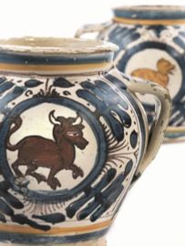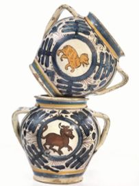 in maiolica, decoro realizzato in policromia, che vede associare la tecnica “a zaffera” in blu di cobalto e piombo, ma poco rilevata, al bruno di manganese e al giallo antimonio. Il corpo ovoidale è rastremato verso il piede che si mostra basso, appena espanso e con base piana. Il collo, breve e cilindrico, si apre in una bocca con orlo tagliato a stecca appena sporgente. Dalla spalla fino alla parte più esterna del corpo si allargano due brevi anse a nastro a piega ortogonale. La decorazione è suddivisa in due metope che occupano gran parte del corpo, delimitate ai lati da sottili linee di manganese, mentre, nella porzione superiore e inferiore, sono rimarcate da una linea gialla che esalta i punti di strozzatura della forma. I riquadri circondati da un motivo a foglie di quercia sono centrati da un medaglione che racchiude un orso (per alcuni un lupo o un felino) andante a sinistra sul fronte e un fiore quadripetalo sul retro nel primo albarello. Nel secondo vaso i medaglioni sono entrambi decorati con figure animali, una delle quali è un toro. I due vasi appartengono a una serie di cui alcuni esemplari recano sotto l’ansa una “N”, riferibile a una bottega attiva a Montelupo alla fine del XV secolo, periodo cui si fa risalire la fine della produzione a zaffera. Gli orcioli hanno un confronto molto prossimo in un orciolo recentemente comparso sul mercato in questa stessa sede e in un altro esemplare, conservato nella Pinacoteca di Varallo Sesia, anch’essi caratterizzati dall’uso di più colori e pertanto ascrivibili forse ad una fase più tardiva della produzione; alt. cm 14,3, diam. bocca cm 9,5, diam. piede cm 8,511