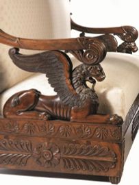 in mogano con schienale imbottito e bordato da larga fascia smussata agli angoli e intagliata con corolle e motivi vegetali e al centro con due palmette contrapposte; braccioli in forma di voluta terminanti in ricciolo con corolla e poggianti su supporti scolpiti in forma di leoni alati; base a fascia intagliata con volute, motivi di conchiglie stilizzate e palmette contrapposte centrate da rosone, sedile rettangolare rivestito in stoffa color crema, cm 102x210x69