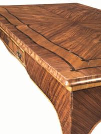 in noce e altre essenze pregiate, piano rettangolare filettato a formare una doppia cornice sagomata; da un lato cassetto centrale affiancato da due cassettini appaiati, ciascun cassetto sormontato da tiretto, dall'altro altro lato grande cassetto centrale, gambe mosse calzate da piedini in bronzo, cm 87x208x113