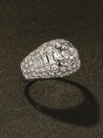 al centro un diamante taglio vecchio a cuscino di 2 ct circa affiancato da due linee di baguette poste in gradazione entro un pave di brillanti, punzone Bulgari, 11 g
