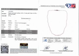 realizzata ad una fila di centoquattordici perle naturali con diametro da 2.7 mm a 6 mm, fermatura allunga acon piccola perla affiancata da rose di diamante, corredata di certificato GCS n. 5776-4201 datato 14.01.2016