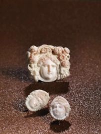 ciascun orecchino in corallo rosa intagliato a teste romane, la spilla raffigurante volto femminile entro cornice di rose e fiori in corallo rosa e bianco, entro astuccio originale