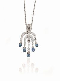 la collana è realizzata da una catenina a maglia sottile in oro bianco 14 K a cui è sospeso un pendente disegnato come un candelabro rovesciato decorato da brillanti e gocce in zaffiro briolette, punzone 750; ciascun orecchino pendente en suite con il pendente, punzone 750, 21 g complessivi