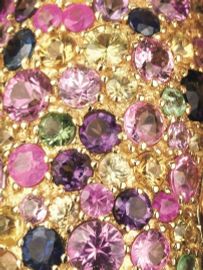 ciascuno a cerchio bombato impreziosito da zaffiri colorati, granati e ametiste, punzone 750, 42 g