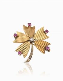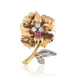 rispettivamente modellate a corolla in oro rosa e giallo con foglie in oro bianco e brillanti taglio vecchio, a stella interamente impreziosita da rose di diamante e rubini e a fiore composto da cinque petali in oro giallo rigato, rubini, brillanti e rose, 32 g complessivi