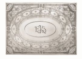 di forma rettangolare, in argento decorato da volute e festoni, al centro monogramma iscritto, interno in velluto, cm 18,5x11,5