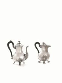 in argento, corpi piriformi poggianti su tre piedini, prese a voluta, finali dei coperchi modellati come fiori, alt. cm 18 e cm 16, complessivi g 590 (2)