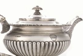 composto di una grande guantiera di forma rettangolare, un samovar, una teiera, una cioccolatiera, una lattiera ed una zuccheriera, ognuno decorato con profili a volute e foglie e da stemma della famiglia Strozzi inciso, complessivi g 8790, entro scatola (6)