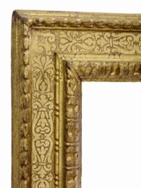 sagoma a cassetta. Battuta a gole lisce, profilo aggettante strigliato con foglie aperte agli angoli, gola liscia, fusarole divise da due perle appoggiano su fascia piatta, abbellita da racemi fogliacei stilizzati su fondo bulinato, profilo di fogliette, gole diritte e rovesce portano a muro. Doratura a guazzo in oro zecchino con preparazione a bolo marrone. Luce cm 97,5x73,2; ingombro cm 121,5x97,2
