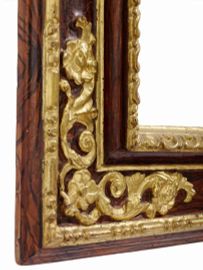 Questa bella cornice, espressione del manierismo maturo, si impone per la costruzione solida e imponente. L’eleganza, ritmata dal contrasto oro-lacca che crea l’effetto del legno, i rabeschi floreali della fascia nonché l’imponente baccellatura, in questo caso sviluppata in obliquo, testimoniano palesemente l’appartenenza alla Toscana.