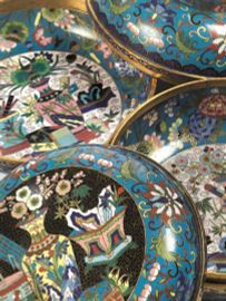 in metallo cloisonné, il coperchio decorato nella parte centrale con un medaglione circolare con gli oggetti preziosi, il bordo e la base con fiori di loto, l'interno delle scatole anch'esse decorate con motivi floreali e gli oggetti preziosi, diam cm 19