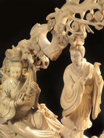 in avorio, modellato nella forma di imbarcazione, con figure femminili intente a suonare uno strumento musicale, sulla prua, una fenice e un cesto di frutta, cm 46x38, poggiante su base in legno alt. cm 6