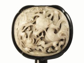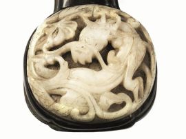 in legno con tre placche ovali in giada bianca decorate a rilievo con draghi, lung. cm 48, poggiante su base in legno e sostegno sagomato ricoperto di tessuto alt. cm 9