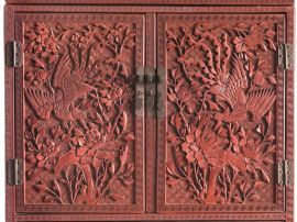 in lacca rossa, a doppio corpo con quattro sportelli e un cassetto alla base, l'interno diviso in scomparti con due cassetti al centro, l'esterno finemente intagliato sul fronte con fenici in volo tra racemi fioriti, i bordi decorati con greche e un ricco motivo geometrico, 35,5x58x16,5