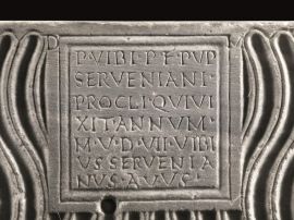 SARCOFAGO STRIGILATO Materia e tecnica: marmo caristio euboico a grana fine scolpito e levigato Piccolo sarcofago destinato ad un bambino, vasca di forma parallelepipeda con bordo arrotondato e lisciato; il fronte è decorato da una serie di strigilature verticali continue opposte, centrate da tabula iscritta con sette linee e decorata con una doppia cornice. D.M. P. VIBI. P.F. PVP SERVENIANI PROCLI.QUIVI XIT.ANNUM. M.V.D.VII VIBI US SERVENIA NUS. AVVS Agli dei Mani e a Publio Vibio Serveniano Proclo, figlio di Publio, della tribù Pupiena, che visse un anno, cinque mesi e sette giorni, Serveniano, (suo) nonno (dedicò) bordo inferiore liscio; interno scalpellato, fianchi non decorati, parte posteriore levigata Produzione: Roma Stato di conservazione: scheggiature diffuse, due fori nella parte anteriore, dovuti alla trasformazione successiva in vasca da fontana, un restauro in malta nella parte superiore destra; altro foro di scarico nella parte posteriore sinistra; il piccolo sarcofago è ricavato dal riutilizzo di un frammento più antico pertinente con probabilità ad un’architrave o uno stipite, fatto testimoniato dalla levigatura della parte posteriore che in origine era a vista Dimensioni: cm 105x36x32 Datazione: inizi III sec. d. C. I sarcofagi strigilati sono così chiamati perché la decorazione ondulata richiama gli strumenti metallici ondulati chiamati appunto strigili, con i quali gli atleti si detergevano del sudore e degli olii della palestra. Diventano molto utilizzati dagli inizi del terzo secolo dopo Cristo e la loro fortuna proseguì fino a tutto il quinto secolo dopo Cristo.