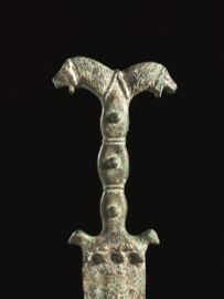 Grande spada con lama foliata allungata e costolata, impugnatura sinuosa decorata da piccoli bottoni, attacco con la lama con due protomi di ariete, pomolo configurato teste di leoni contrapposte con le fauci spalancate ed il pelame reso a piccoli tratti