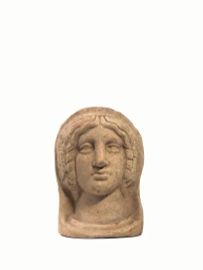 Ex voto costituito da una testa femminile giovanile velata con capelli accuratamente pettinati scompartiti sulla fronte e che ricadono in piccole trecce distinte a coprire le orecchie, ampia fronte, occhi con palpebre delineate, naso rettilineo, bocca pronunciata, mento arrotondato, alla base del collo accenno della veste; parte posteriore non lavorata