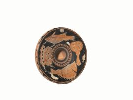 Piatto con largo orlo pendulo; vasca troncoconica appiattita, con tondello depresso al centro; breve piede troncoconico, decorato sul bordo con tralcio di olivo, nella vasca con due grandi pesci, una torpedine ed un polpo volti a sinistra e separati da un gambero, una sardina ed un mollusco; tondello al centro decorato con meandro ad onda; ricomposto da tre frammenti, diam. cm 17; metà IV sec. a. C.