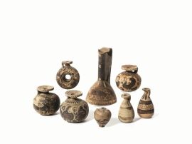 Lekythos a ventre conico, con bocca trilobata, lungo collo, alta ansa a nastro, fondo piatto e corpo decorato con teoria di animali e riempitivi; alabastra con bocchello a disco, piccola ansa a presa inserita sotto al bocchello, corpo ovoide allungato, fondo concavo; decoro a fasce e puntini; aryballoi con bocchello a disco, piccola ansa a nastro inserita sotto al bocchello, corpo globulare, decorati con teoria di guerrieri gradienti a sinistra, coperti dagli scudi circolari, un leone e una pantera, due sfingi alate affrontate ai lati di un cigno, cani in corsa, aryballos globulare decorato con serpente sinuoso (8)
