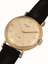 Cassa in due corpi con fondello a scatto, anse a goccia. Quadrante argentè con indici applicati a bastone e numeri arabi 3,6 e 12 di cui il 3 e il 6 orizzontali, lancette Dauphine, secondi a ore 6. Movimento a carica manuale calibro 12-120. Cinturino in pelle con fibbia ad ardiglione in oro 18 k Patek, cassa, quadrante e movimento firmati