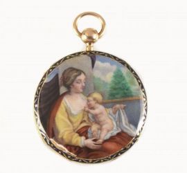Cassa in oro giallo interamente decorata in smalti policromi con scena raffigurante madre che allatta il bambino, carrure guilloche, lunetta in smalto blu a volute floreali oro. Quadrante in argento numeri romani e parte centrale guillochè, lancette a foglia e traforata blu. Movimento con scappamento a cilindro, suoneria con ripetizione ore e quarti, carica e rimessa delle ore a chiavetta.