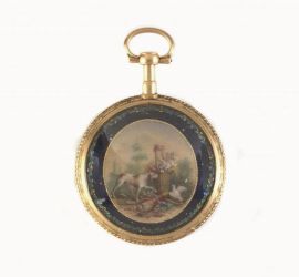 Cassa in oro con profili cesellati a motivi floreali decorata sul retro in smalto blu con corone di fiori e foglie e miniatura ovale raffigurante scena campestre con cane da caccia e colombi con faretra, arco e cestino di fiori. Quadrante in smalto bianco con ore e minuti in numeri arabi, apertura per la chiavetta di carica ad ore 2. Movimento firmato con scappamento a verga.