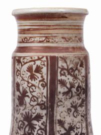 Il ductus pittorico incerto, la scarsa padronanza della tecnica del lustro e il supporto ceramico di qualità non elevata hanno fatto ipotizzare a Marino Marini, che ha lungamente studiato l’opera, che l’albarello possa essere stato prodotto in Italia forse per rimpiazzare un esemplare originale andato perduto. Questa pratica è documentata a Manises per conto di committenti italiani (1), e l’evidente ricerca di aderire il più possibile al modello ispanico sia nella morfologia sia nel decoro avvalorerebbe questa ipotesi.