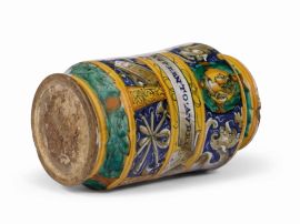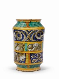 La forma è ormai cinquecentesca e l’opera, visti i numerosi confronti in musei e collezioni private, probabilmente apparteneva ad una Spezieria di grandi dimensioni. Si veda ad esempio l’albarello, simile per impostazione e distribuzione del decoro con il cartiglio apotecario al centro, del British Museum (2) attribuito alla bottega di Ludovico e Angelo Picchi, che reca scritto in un cartiglio sul retro "fatto in terra [d]i durante nel stato du”. Un altro esemplare con impianto decorativo appena differente, ma coerente con gli altri albarelli di questa spezieria, è conservato all’Ashmolean Museum di Oxford (3) con attribuzione alla bottega di Ludovico ed Angelo Picchi, derivante da precise indicazioni apposte sui cartigli dei vasi. Un albarello della stessa spezieria, già della collezione Pringsheim, reca in cartiglio la scritta “Fato in terra Duranti 1555” (4). Anche un vaso della collezione Mereghi, ora al Mic di Faenza, che reca invece la scritta “realizzato in Castello durante nel 1562 da mastro Simono” è da alcuni associato anche a questa produzione (5). Ancora da questa serie provengono un albarello in collezione Roche (6) datato 1551, uno della Bayer con decoro a trofei, uno con delfini e cerquate associate a motivo a trofei nella Pinacoteca di Varallo Sesia in collezione Franchi (7) ed infine uno nella collezione della Cassa di Risparmio di Perugia (8).