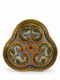 [8] Un altro confronto ci deriva dal bacile trilobato del Getty Museum, dove però il carattere stilistico delle grottesche e delle divinità marine, pur avvicinandosi per programma iconografico alla nostra opera sono differenti. Il bacile del Getty è attribuito a Flaminio Fontana (HESS 2002, pp. 192-197, n. 35);