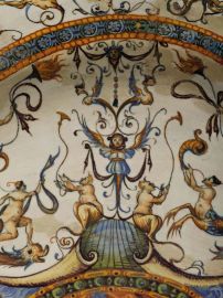 Un sottile e raffinato decoro a grottesche racchiuse in riserve a forma di valva di conchiglia interessa l’intera superficie. Tali grottesche partono da una candelabra posta al centro e si sviluppano in modo simmetrico con figure di satiri, mostri marini e piccoli animali. Lo stile è quello delle raffaellesche giunte ad Urbino intorno al 1520, che traevano origine dalla conoscenza quattrocentesca delle pitture romane della Domus Aurea di Nerone, elaborate poi secondo il gusto rinascimentale fino a giungere al repertorio delle Logge Vaticane. Lo spazio tra le tre riserve è decorato con uno sfondo a onde su cui galleggiano tre figure trasportate da mostri marini: Poseidone e due Naiadi.