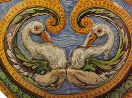 Sul retro tre coppie di cigni a rilievo sono iscritte in altrettante lobature che simulano una cornice metallica e che si uniscono al centro in un fiore a rilievo dipinto in manganese. L’orlo è sottolineato da motivi continui di fogliette lobate e medaglioni centrati da fioretti su fondo scuro. Tutte le campiture libere invece sono decorate con motivi che riproducono le onde marine. Al centro è dipinto l'episodio della Sottomissione degli Elvezi a Giulio Cesare[1].